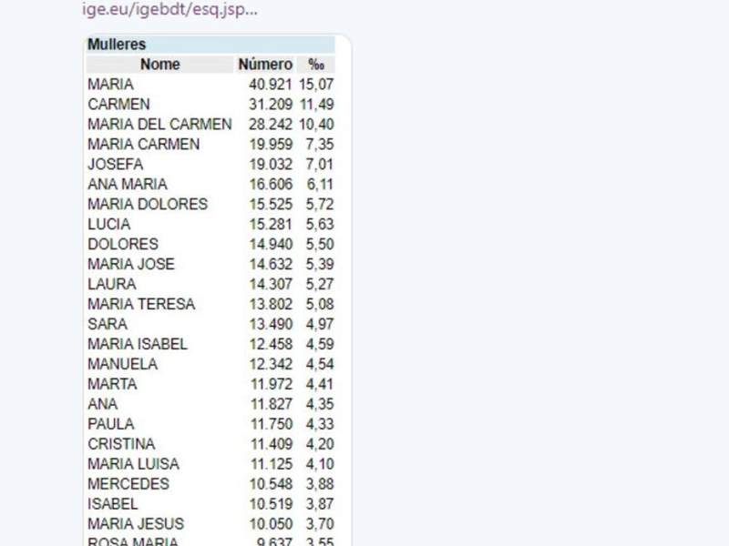 Si se llaman ustedes María, Carmen, María del Carmen o María Carmen, sepan que tienen los nombres más comunes de Galicia. Según el IGE hay 40.000 Marías en nuestra comunidad, 31.000 cármenes y 28.000 maría del Carmen. También son muy comunes otros como Ana María, María Dolores o Lucía.