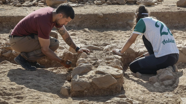 Dos jóvenes trabajan en las excavaciones en el yacimiento tartesio de Tejada la Vieja, en Escacena (Huelva)