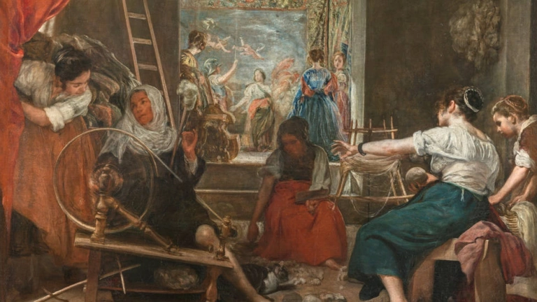 Las Hilanderas muestra la “pelea” entre la diosa Palas y la humana Aracne que la desafió. Aracne aparece de espaldas en la parte derecha del cuadro, y la diosa, de perfil en el lado izquierdo de la pintura, caracterizada como una anciana. Al fondo, Velázquez pintó un tapiz de “el rapto de Europa” ejecutado 40 años antes por Tiziano. Es una maravilla técnica que ahora vuelve a lucir tal y como la concibió el genio sevillano que “crea una especie de perspectiva conceptual de manera que lo que es al principio una taller de hilanderas se convierte al final en una reflexión sobre el arte de la pintura”.