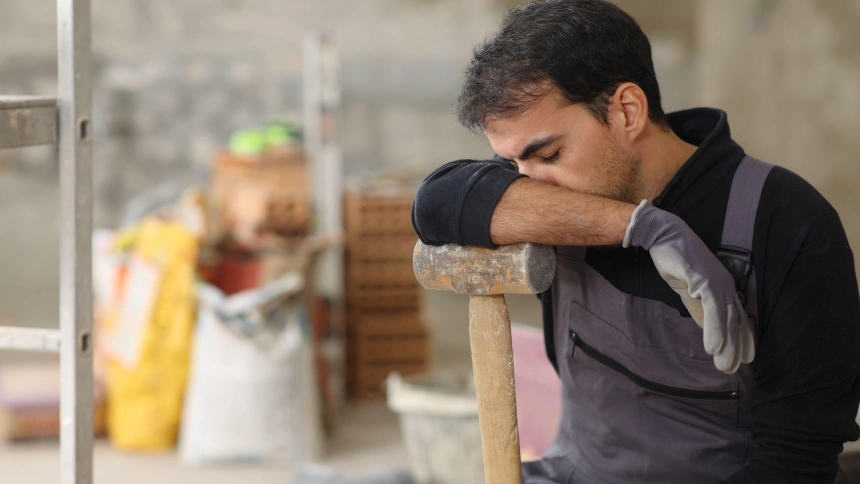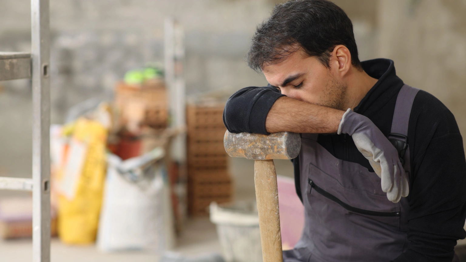Trabajador de la construcción cansado descansando apoyado en un martillo en una casa en renovación