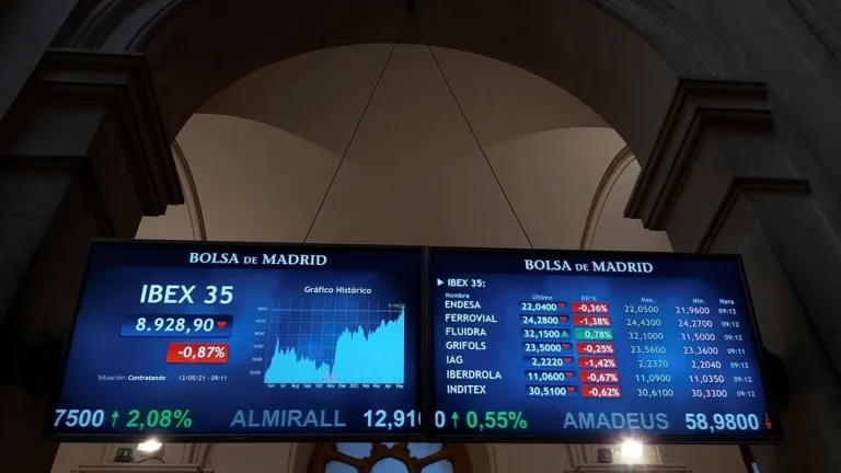 Una pantalla muestra la evolución del índice IBEX 35 minutos después del inicio de la sesión en la Bolsa