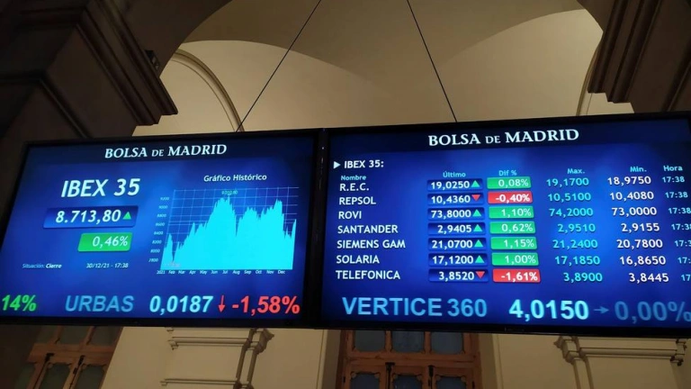 El índice Ibex 35 cierra la primera sesión del año en 8.761 puntos, con alza de un 0,54 por ciento