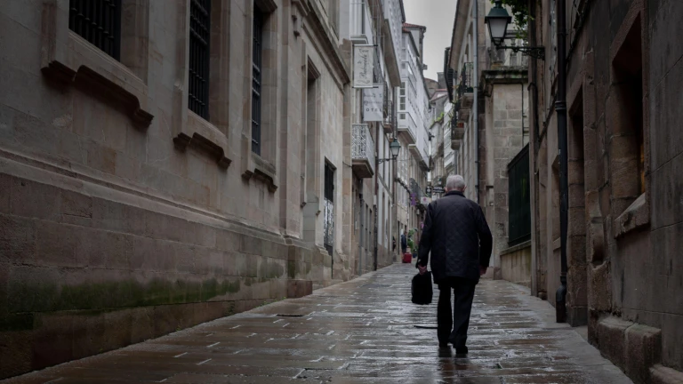 Un anciano solitario camina por una calle del casco antiguo de Santiago de Compostela