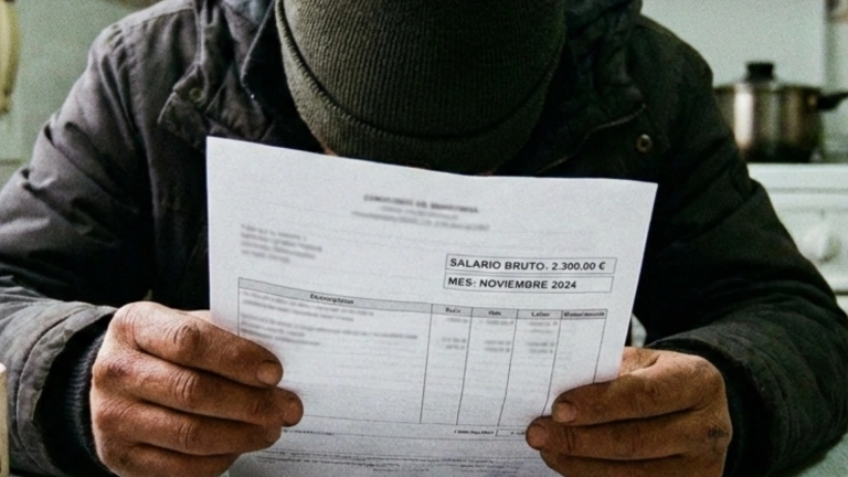 Una persona irreconocible que mira una nómina que cobra un salario bruto de 2.300 euros al mes