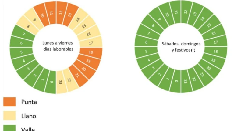 Los precios de los peajes y cargos serán diferentes entre los periodos horarios, tanto de potencia como de energía. En el caso de la potencia de lunes a viernes en los días laborables la 'valle' irá de las 00.00 horas a las 07.00 horas, mientras que la 'punta' será de 08.00 horas a las 24.00 horas. En el caso de los fines de semana y festivos, el término potencia será 'valle' todo el día.