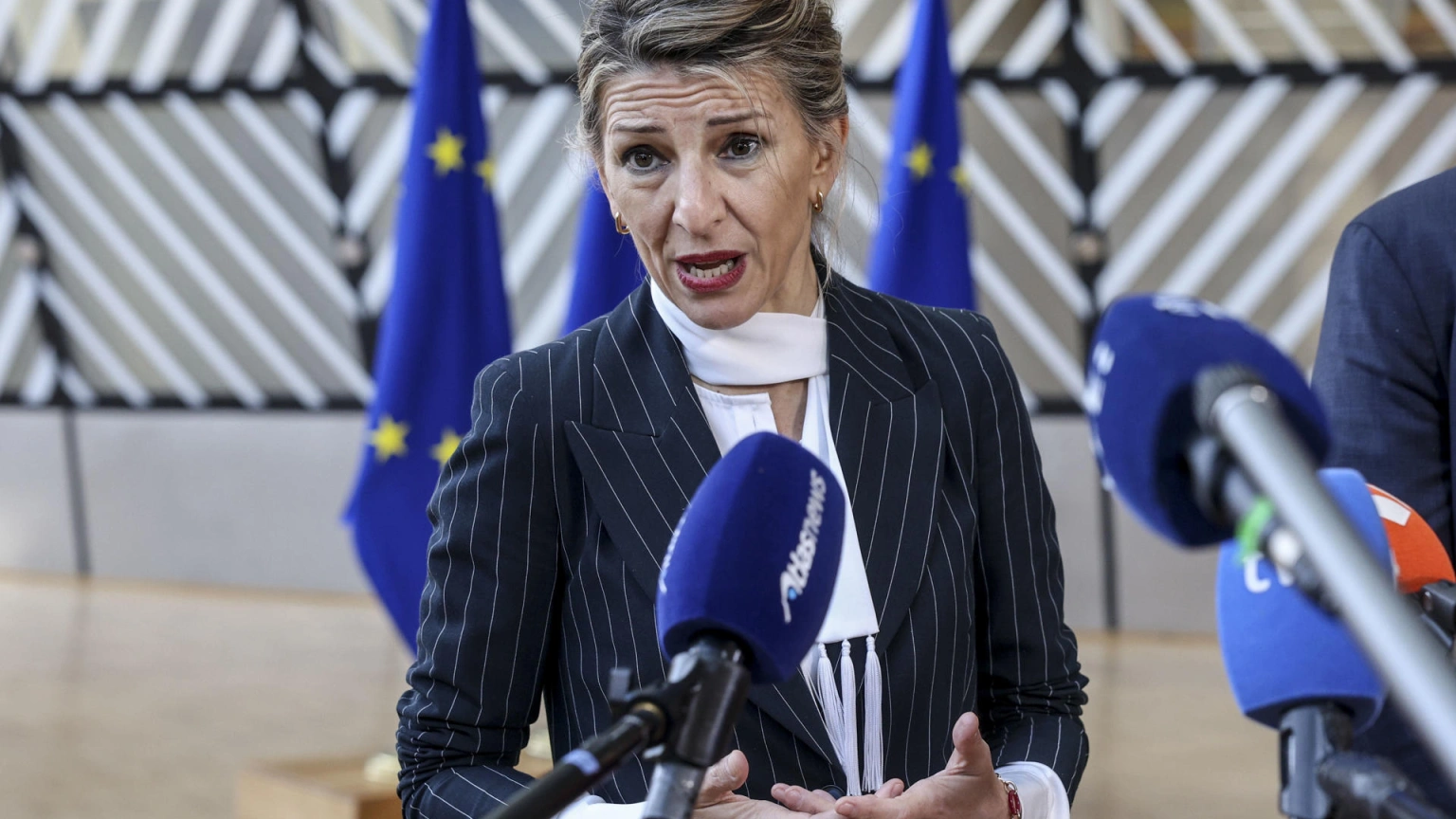 La vicepresidenta segunda y ministra de Trabajo, Yolanda Diaz, atiende a los medios en el marco de su participación en el Consejo Europeo, en Bruselas.