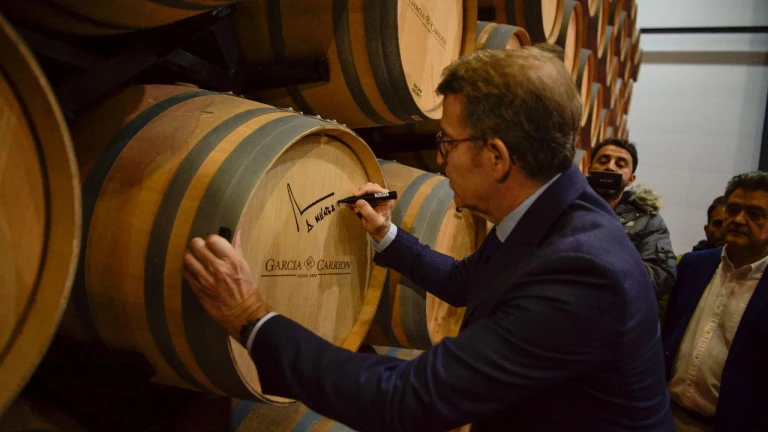 El presidente del PP, Alberto Núñez Feijóo, firma una barrica de vino durante su visita por las instalaciones de la empresa García Carrión en Daimiel, Ciudad Real.