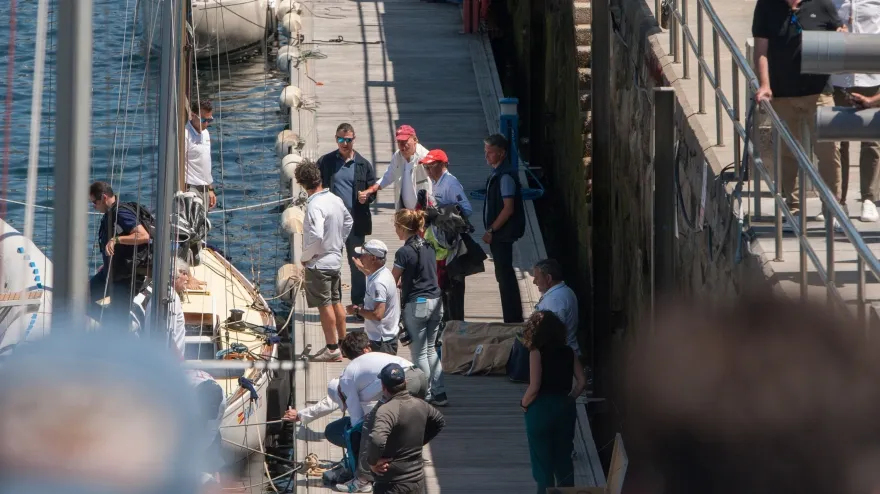 Juan Carlos I desembarca de la lancha de apoyo al 'Bribón', que queda primero en la regata de Sanxenxo