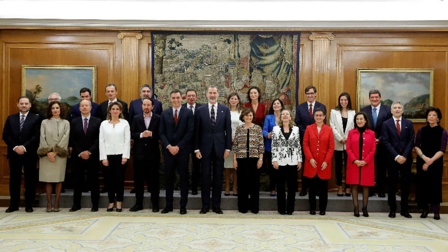 El Rey, Felipe VI, ha presidido en el Palacio de la Zarzuela el acto de promesa de sus cargos por parte de los vicepresidentes y ministros del nuevo Ejecutivo de Sánchez, el primer ejecutivo de coalición de la historia de nuestra democracia.