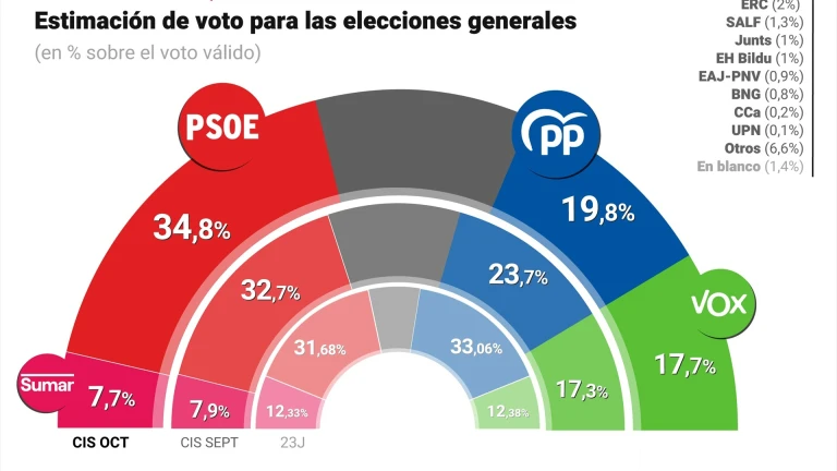El muestreo, a partir de 4.029 entrevistas realizadas entre el 1 y el 7 de octubre, concede al partido de Santiago Abascal una estimación de voto del 17,7 %, cuatro décimas más que en septiembre, mientras el PP pierde 3,5 puntos y el PSOE gana 2,1.
