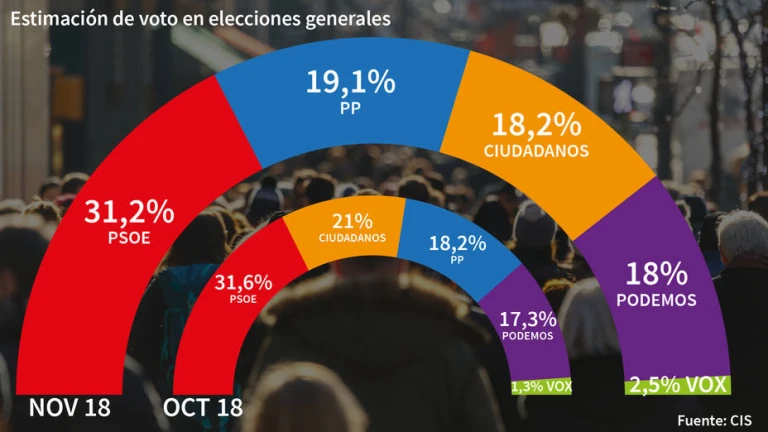 Ciudadanos es quien pierde más apoyos, al retroceder del 21% al 18,2% es estimación de voto. Vox doblaría resultados pero no obtendría representación