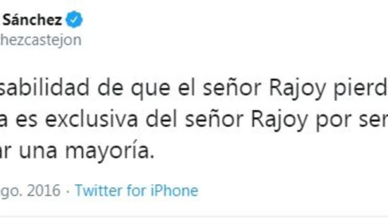 Pedro Sánchez no borra los suyos, eso le honra, pero su pasado le persigue día sí día también. Famoso e histórico es su “no es no, qué parte del no no has entendido” y que hoy resuena con fuerza cuando pide la abstención a PP y C's, pero hoy, el día en que su segundo intento de investidura ha sido un gran fracaso, resuena un tuit suyo que reza así: “La responsabilidad de que el señor Rajoy pierda la investidura es exclusiva del señor Rajoy por ser incapaz de articular una mayoría”.