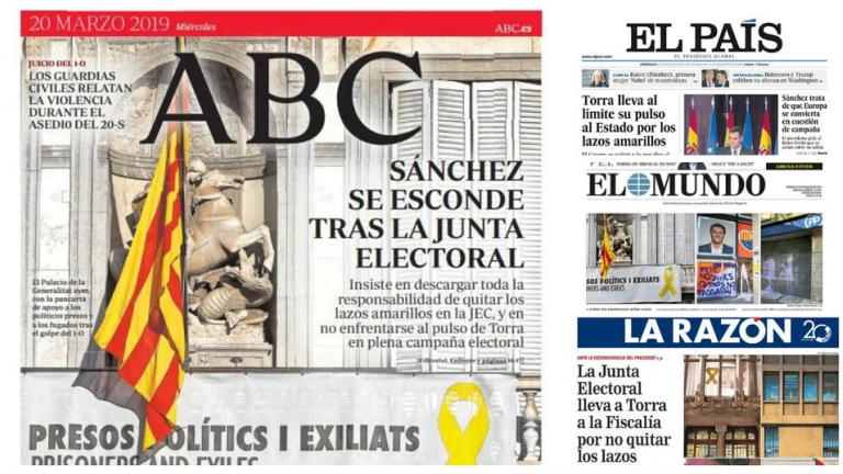 En el diario 'ABC' podemos leer: "Sánchez se esconde tras la Junta Electoral"; "Insiste en descargar toda la responsabilidad de quitar los lazos amarillos en la JEC, y en no enfrentarse al pulso de Torra en plena campaña electoral". Todo representado con una fotografía del Palacio de la Generalitat a toda página.