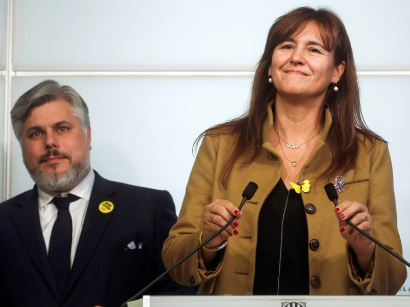 GRAFCAT8364. BARCELONA, 25/11/2019.- La portavoz de JxCat en el Congreso, Laura Borrás, acompañada del presidente del grupo parlamentario de JxCAT, Albert Batet (i), durante la rueda de prensa que ha ofrecido tras la reunión de la dirección del partido en la que ha afirmado que JxCat exige para la investidura del líder del PSOE, Pedro Sánchez, que haya diálogo "de igual a igual, entre gobiernos", sin "condiciones" ni "exclusiones" en los interlocutores de la Generalitat y del espacio postconvergente, y con la figura de un "mediador internacional". EFE/Quique García