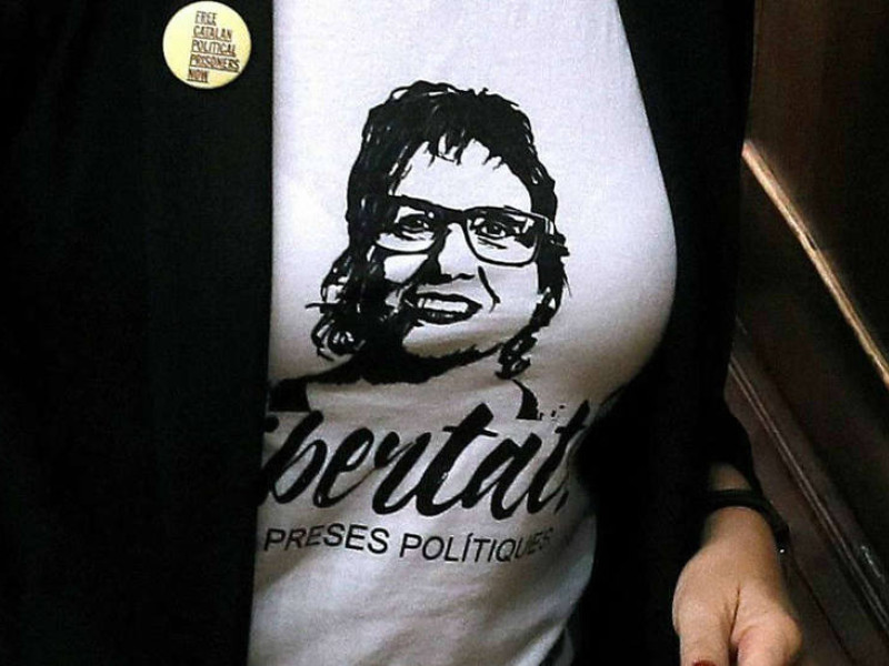 GRAF2131. MADRID, 03/12/2019.- La diputada de ERC Montserrat Bassa, con una camiseta con el rostro de su hermana, Dolors Bassa, tras emitir su voto para la Presidencia del Congreso durante la sesión constitutiva de la Cámara Baja. EFE/Ballesteros