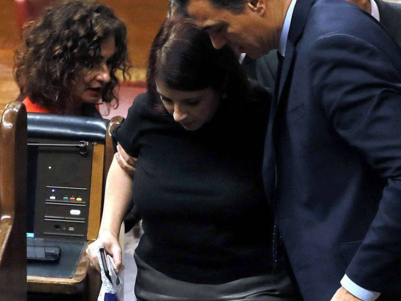 GRAF2200. MADRID, 03/12/2019.- La portavoz del PSOE en el Congreso, Adriana Lastra, ha tropezado este martes en las escaleras del hemiciclo cuando se dirigía a votar y se ha caído al suelo junto al escaño del presidente del Gobierno en funciones, Pedro Sánchez, quien le ha ayudado a levantarse. EFE/Ballesteros