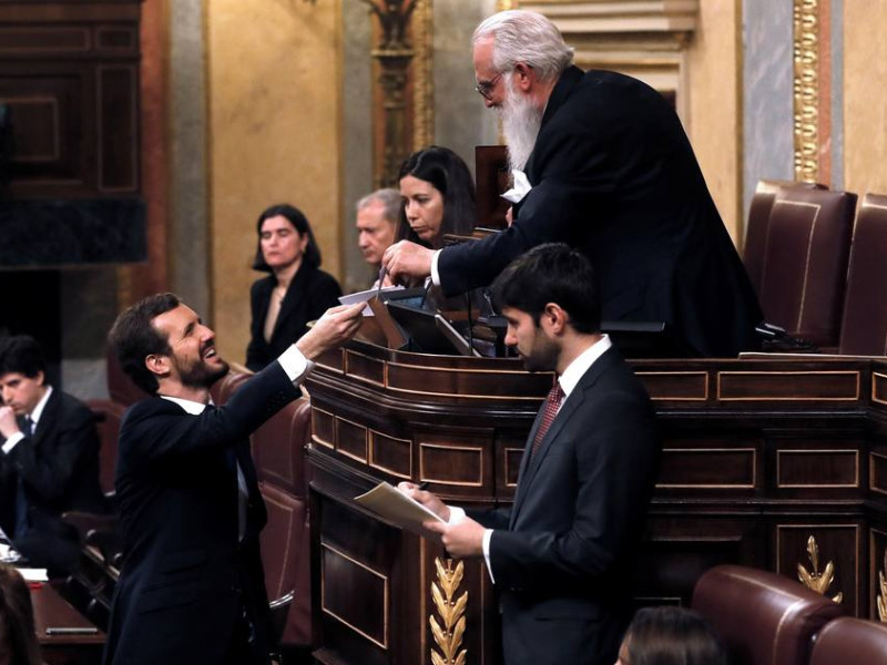GRAF2199. MADRID, 03/12/2019.- El presidente del PP, Pablo Casado, entrega su voto para la Presidencia del Congreso al presidente de la Mesa de Edad, Agustín Javier Zamarrón (d), durante la sesión constitutiva de la Cámara Baja. EFE/Ballesteros