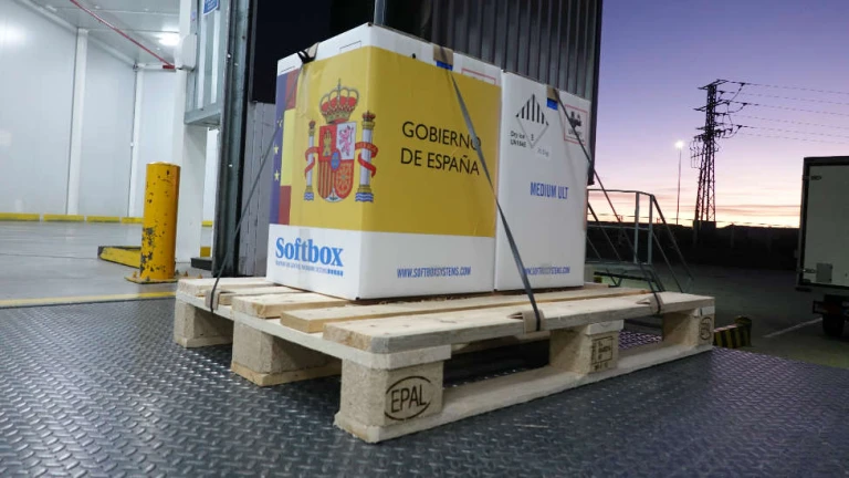 En las imágenes difundidas por el Ejecutivo de Sánchez, se puede ver sobre un palé, una caja de gran tamaño con un notorio precinto del 'Gobierno de España', enfocado en todo momento por la cámara.
