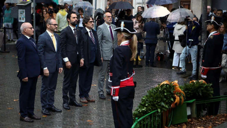 El presidente de la Generalitat, Quim Torra, y el resto de miembros de su Govern han abierto este miércoles la tradicional ofrenda floral al monumento a Rafael Casanova con motivo de la Diada, mientras sonaban los acordes del himno español procedentes del balcón de un hotel adyacente. A las 9.00 horas de esta mañana lluviosa, flanqueados por una formación de gala de los Mossos d'Esquadra, Torra y sus consellers se han acercado al monumento situado en la Ronda de Sant Pere de Barcelona para depositar su ofrenda.