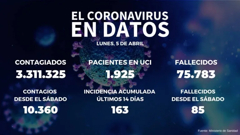 Las comunidades autónomas han notificado este lunes al Ministerio de Sanidad 10.360 nuevos casos de coronavirus, de los que 2.247 han sido diagnosticados en las últimas 24 horas, frente a los 2.089 registrados el sábado 3 de abril. Hasta la fecha, en España ya se han contagiado 3.311.325 personas.