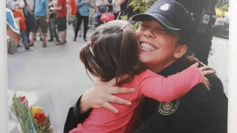 La fotografía muestra a una niña de espaldas que se abraza a una agente de la Policía Nacional tras entregarle un ramo de flores. De fondo se ve a otro policía de uniforme sonriente y varios de los ciudadanos que se agolparon en la Jefatura de Vía Laietana, uno de los puntos de mayor virulencia en las protestas contra la sentencia del Supremo y edificio que los partidos independentistas quieren cerrar para convertirlo en un museo de la represión franquista.