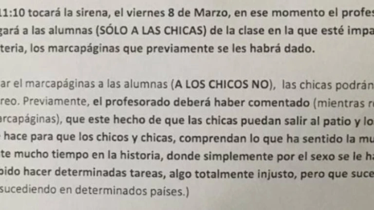 Serrano adjunta el documento del instituto en el que se afirma que el 8 de marzo tocará la sirena a las 11.10 horas, momento en el que el profesorado entregará "a las alumnas (SOLO A LAS CHICAS) de la clase que estén impartiendo su materia, los marcapáginas que previamente se les habrá dado".