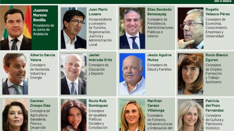 El nuevo gobierno de la Junta de Andalucía, cuenta con 11 consejerías -dos menos que el anterior- y está formado por cinco mujeres y seis hombres, además del jefe del Gobierno.