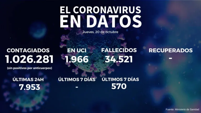 El Ministerio de Sanidad ha notificado 20.986 nuevos casos de covid, 7.953 en las últimas 24 horas, con lo que la cifra total desde el inicio de la pandemia asciende a 1.026.281 contagios, y la de muertos a 34.521, con 155 más.