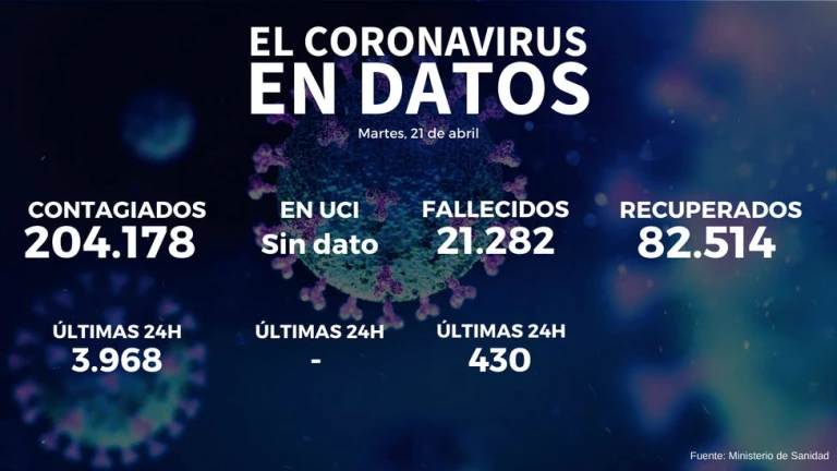 La cifra de fallecidos diarios con coronavirus ha repuntado este martes tras cuatro días consecutivos de descenso hasta los 430, con lo que ya superan los 21.000, y lo mismo ha sucedido con la de contagios, que han sumado otros 3.968, lo que supone un total de 204.178 positivos.