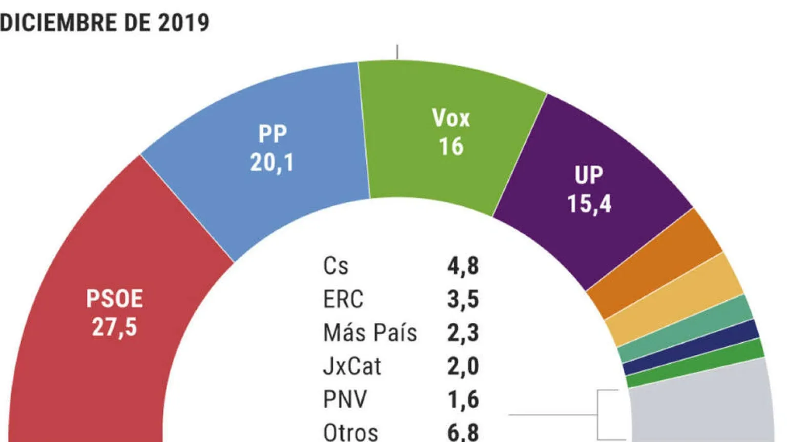 Según el sondeo de Sigma Dos para El Mundo, antes de conocerse los términos del pacto PSOE-UP y las concesiones hechas a ERC y PNV para convencerles de que respaldasen un Gobierno de Sánchez, los socialistas conseguirían un 27'5% de los votos, por lo que perderían apoyos con respecto a las pasadas elecciones (28%) debido a la estrategia de negociación con los separatistas.