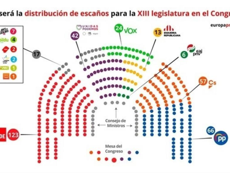 La mayoría que el PSOE y Unidas Podemos tienen en la Mesa del Congreso permitió este martes la aprobación de un reparto de los escaños en el hemiciclo que no tuvieron el apoyo ni del PP ni de Ciudadanos y que dejó a los diputados de Vox ubicados en el "gallinero" de la bancada central del hemiciclo. En la distribución aprobada, los 24 diputados de Vox se colocarán en las dos últimas filas de la bancada central, el "gallinero" del hemiciclo y fuentes de la formación ya han indicado que piensan recurrir la decisión. Estarán detrás de los parlamentarios de ERC y del PNV, cuyos seis escaños se localizarán en la parte baja de la bancada central. De hecho, el PNV tendrá asientos en la primera fila de la Cámara Baja pese a tener 18 escaños menos que Vox y haber obtenido solo 400.000 votos frente a los 2.677.000 de la formación de Abascal.