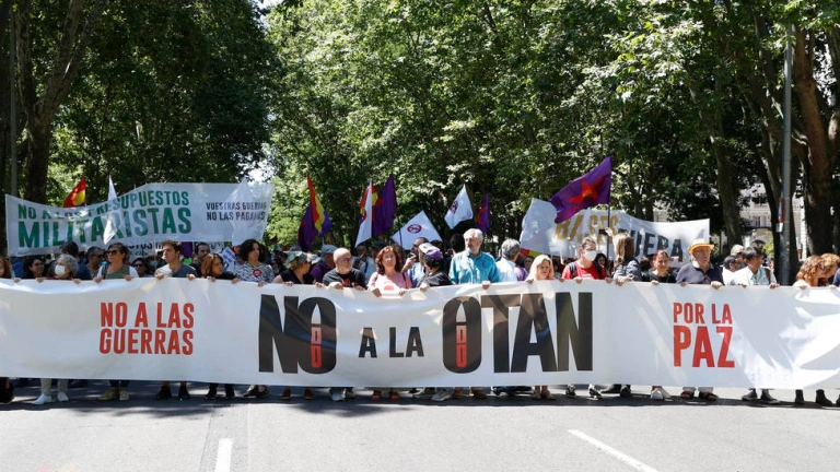 En la marcha, convocada por la Asamblea Popular contra la Guerra, la Plataforma Estatal por la Paz y la Asamblea OTAN NO Madrid, los asistentes, han coreado consignas como "OTAN no, bases fuera" o "gastos militares para escuelas y hospitales", y han portado pancartas con lemas como "paz", "no a la guerra" o "vuestras guerras no las pagamos".