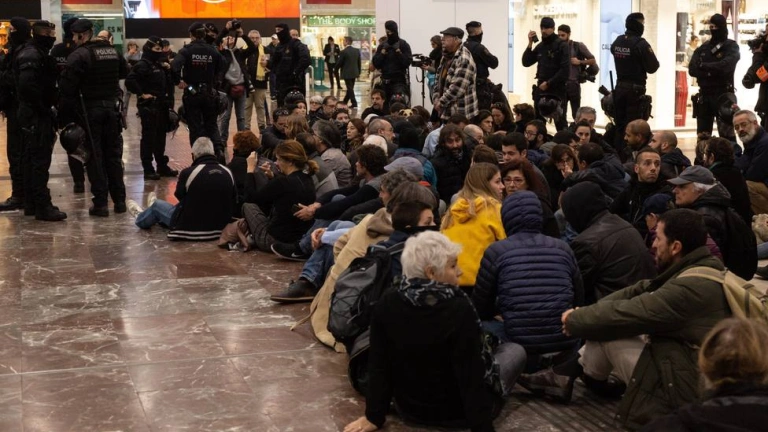 La concentración ha empezado antes de las 11.00 con unas 100 personas sentadas en el vestíbulo y después los policías han empezado a sacarlas una a una a la calle, donde se concentran otrsa 300 personas y aplauden a los desalojados.