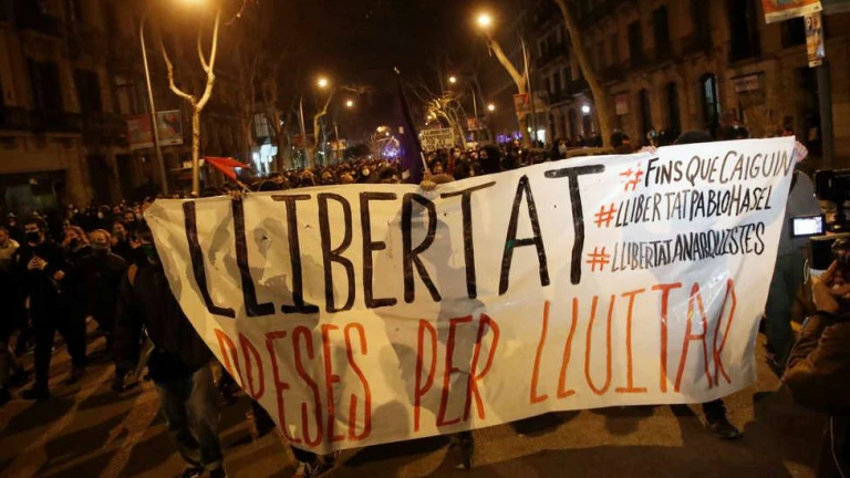 La manifestación ha reunido a varios centenares de personas en la plaza Tetuán de Barcelona, situada junto a la sede de departamento de Interior de la Generalitat, para pedir la libertad del rapero Pablo Hasél y de los detenidos en los disturbios de las últimas semanas, entre ellos miembros de grupos anarquistas.