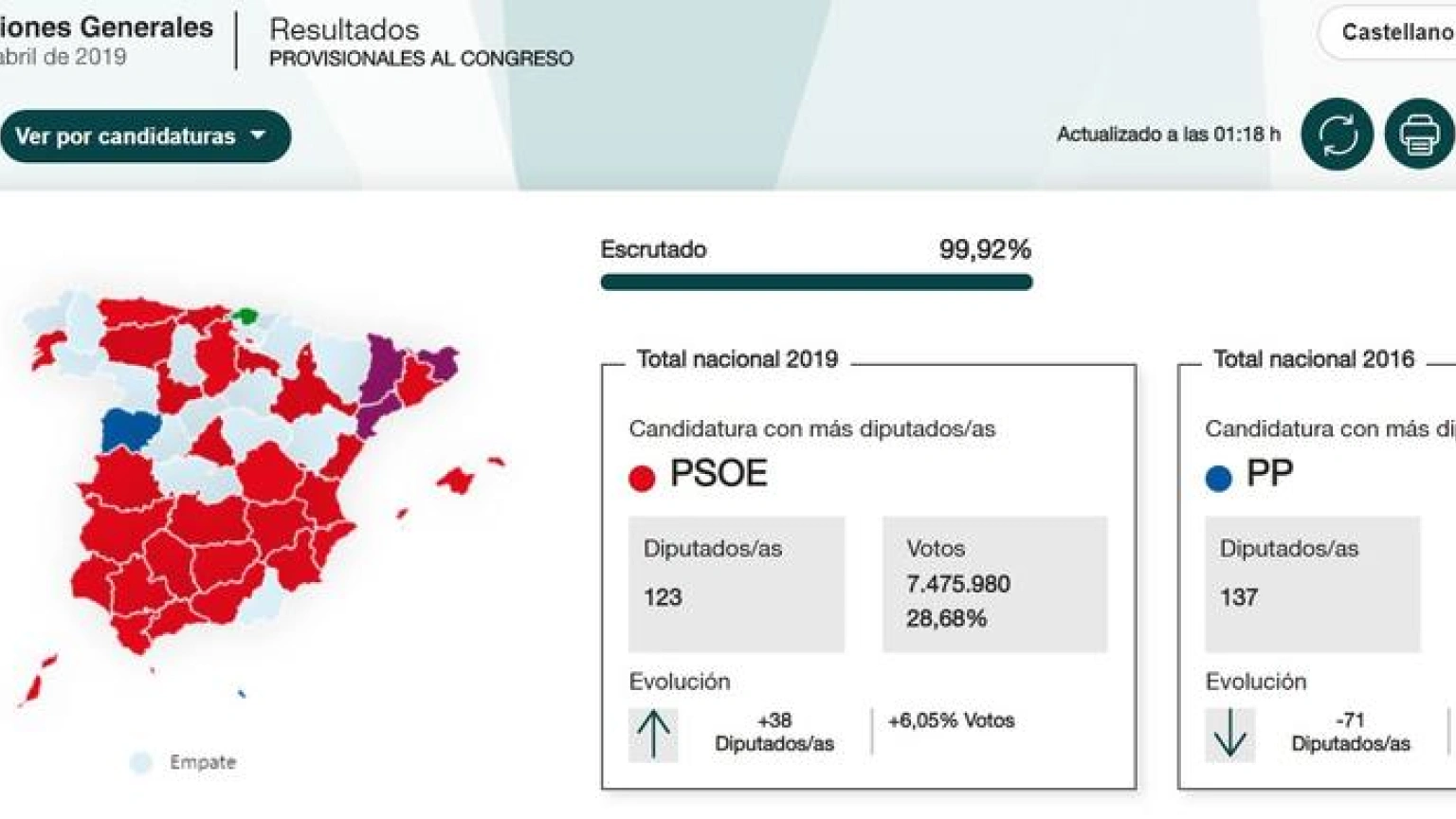 El Partido Socialista es la fuerza más votada en estas elecciones generales en 39 provincias más la ciudad autónoma de Ceuta, mientras el Partido Popular sólo gana en cinco (Salamanca, Ávila, Lugo, Ourense y Melilla) y el resto se las reparten entre ERC y el PNV. Unidas Podemos, Ciudadanos y Vox no obtienen mayoría en ningún territorio, con un 99,92% escrutado.