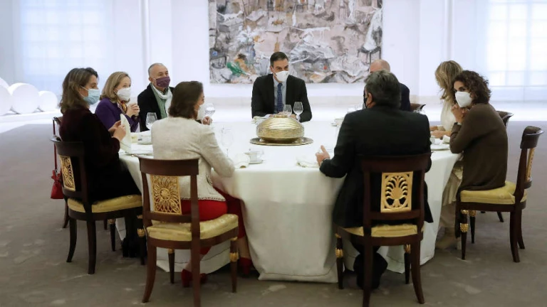 Este martes, de hecho, Sánchez ha tenido un particular interés en exhibir un Gobierno unido alrededor del acuerdo sellado por José Luis Escrivá sin la patronal de la subida del 0,6% de las cotizaciones sociales. De ahí la convocatoria del Presidente de un rápido café con los secretarios generales de UGT, José Álvarez, y de CCOO, Unai Sordo, compartiendo mesa y mantel con seis ministros económicos, incluidas Nadia Calviño y Yolanda Díaz. La carga política de la imagen ha vinculado la negociación a las dos órbitas del Ejecutivo y ha sido apuntalada con la cesión de la atalaya mediática monclovita ala misma Díaz.