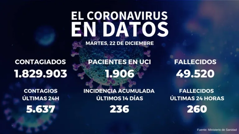 Respecto a las pruebas diagnósticas, desde el pasado 12 de diciembre y hasta el 18 de diciembre se han realizado 951.734, de las cuales 625.877 han sido PCR y 325.857 test de antígenos. La tasa total de positividad se sitúa en el 8,32 por ciento.