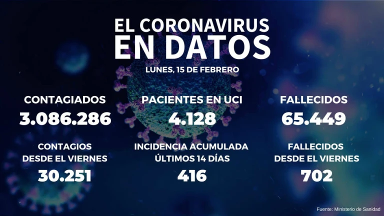 La cifra total de contagios en España se eleva ya a 3.086.286 desde el inicio de la pandemia, según las estadísticas oficiales. La incidencia acumulada en los últimos 14 días por 100.000 habitantes se sitúa en 416, frente a 496 el viernes. En las pasadas dos semanas se ha registrado un total de 196.059 positivos.