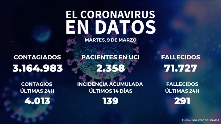 Respecto a los fallecidos por Covid-19, este martes se han notificado 291 más, de los cuales 543 se han registrado en la última semana. Esto hace que la cifra global de muertos por coronavirus en España se eleve a las 71.727 personas.