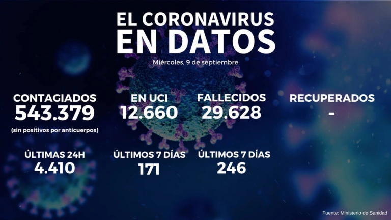 El Ministerio de Sanidad ha notificado 8.866 nuevos contagios este miércoles, 4.410 de ellos en las últimas 24 horas, con lo que la cifra total se eleva a 543.379, y la de muertos a 29.628, 246 más en los últimos 7 días.