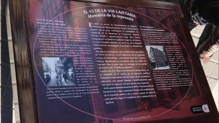 Además, el Ayuntamiento de Barcelona ha instalado una placa informativa sobre la "memoria de la represión", que señala el edificio de jefatura, en el 43 de Via Laietana de Barcelona, como el "espacio más emblemático de la represión política de la ciudad".