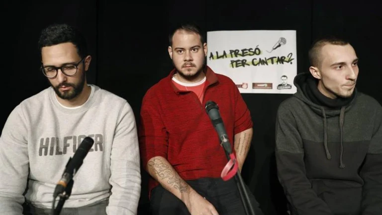 Los raperos Valtonyc (i), Pablo Hasel (c) y Elgio (d), todos ellos en peligro de prisión por los procesos jud