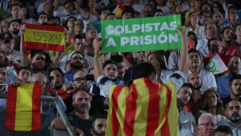 Desde el escenario circular, presidido por dos enormes columnas que simulaban a las torres de Hércules del escudo de España y en medio el logotipo de Vox, se han repetido los mensajes de Vox contra la inmigración ilegal, el feminismo radical, el aborto o la despoblación y se ha vuelto a defender la unidad de España y a pedir la ilegalización de los partidos independentistas y la supresión de las comunidades autónomas.