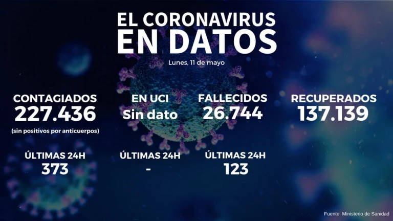 El número de fallecidos con coronavirus ha caído este lunes a 123, la cifra más baja desde el 18 de marzo, con lo que ya suman 26.744, y la de contagios confirmados por PCR se ha desplomado a 373, un número que no se veía desde el día 9 de ese mes y que eleva el total a 227.436.