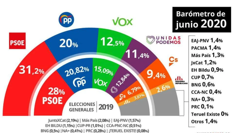 En la tercera encuesta elaborada por el CIS desde la declaración del estado de alarma, cuyo trabajo de campo se llevó a cabo entre el 1 y el 9 de junio, el PSOE obtendría un 31,2%
