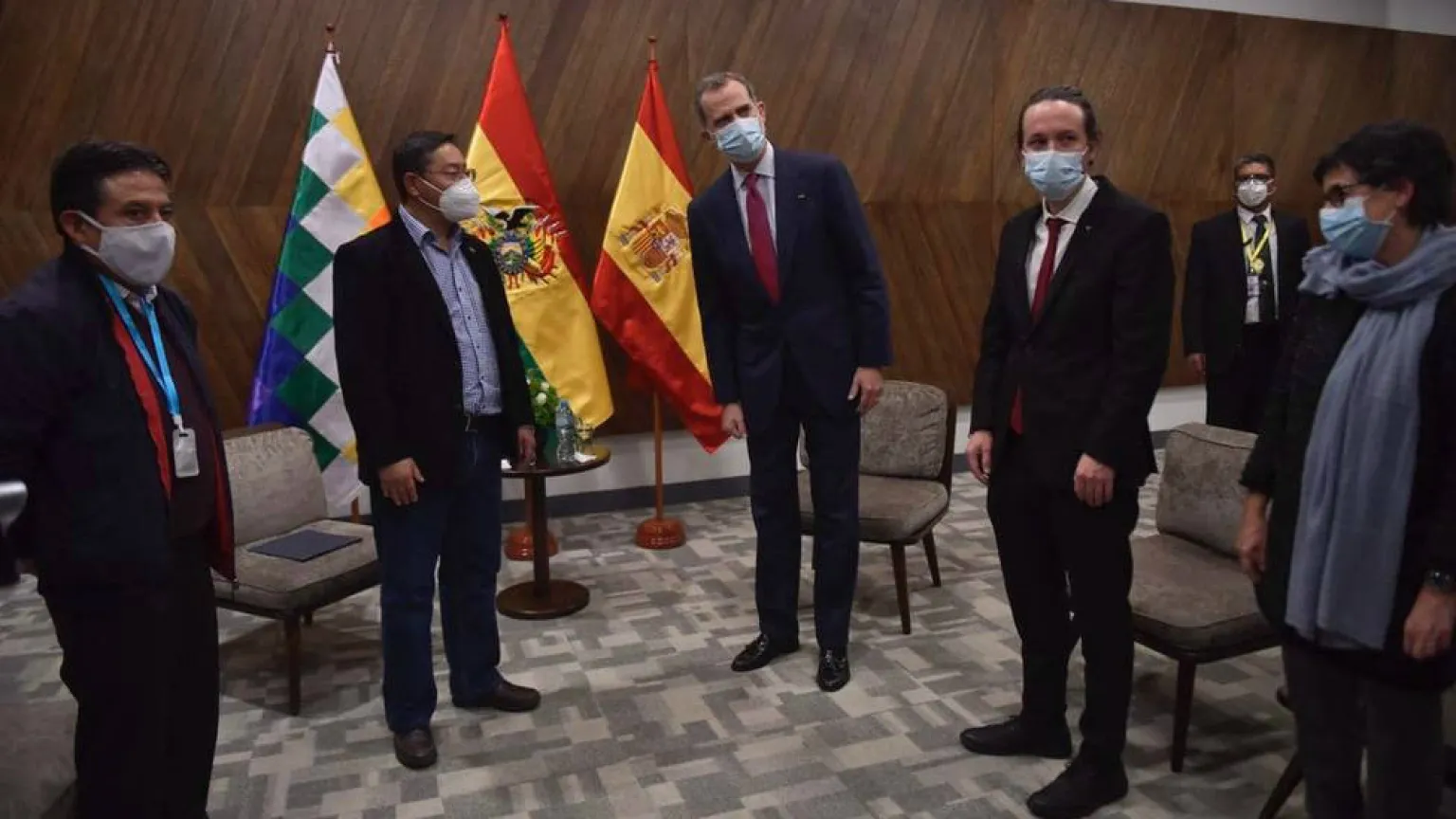 Felipe VI llegó el sábado por la noche a Bolivia acompañado del vicepresidente segundo del Gobierno y la ministra de Exteriores, Arancha González Laya, donde ya han mantenido un encuentro con Luis Arce.