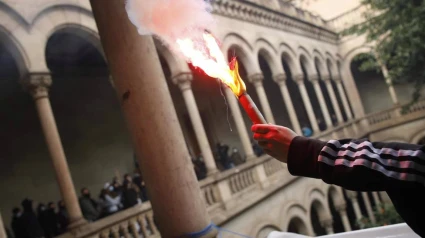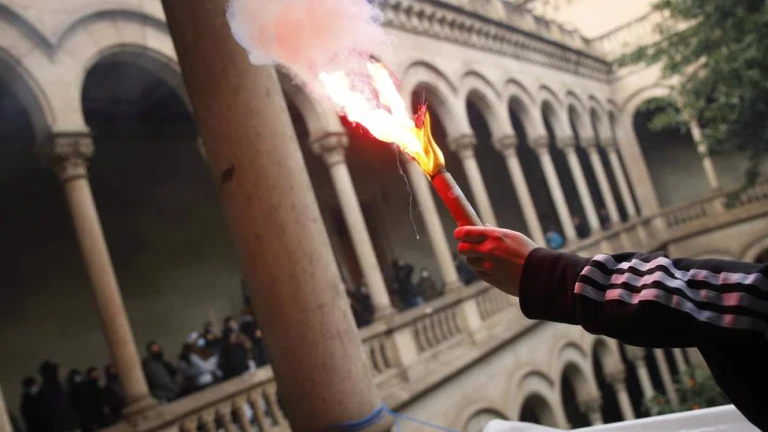 Medio centenar de estudiantes han irrumpido este viernes en las oficinas de vicerrectorados y en los patios del edificio histórico de la Universitat de Barcelona (UB), donde han encendido bengalas, en protesta contra el encarcelamiento del rapero Pablo Hasél.