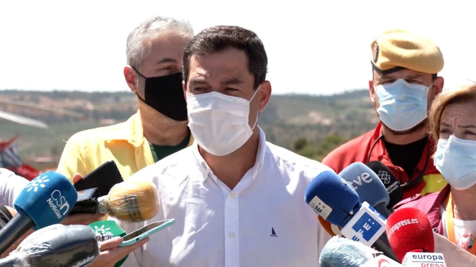 El presidente de la Junta de Andalucía, Juanma Moreno, visitó el Puesto de Mando Avanzado del incendio forestal de Almonaster la Real