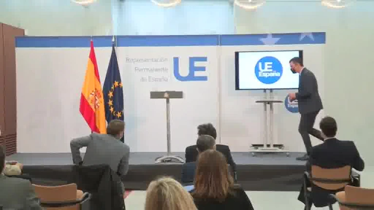 El presidente del Gobierno, Pedro Sánchez, ha comparecido en rueda de prensa tras el Consejo Europeo Extraordinario en Bruselas. Lo que ha sorprendido son las palabras que ha dicho al término de la misma, cuando creía que el micrófono estaba cerrado. Sánchez se ha puesto la mascarilla, ha alzado la cabeza y ha dicho "Mu bien". Una 'cazada' en toda regla. Además, se escucha cómo se hace daño cuando baja del escenario. Así ha sido la escena.
