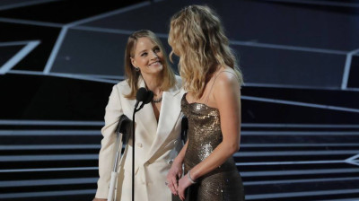 Jodie Foster con muletas y Jennifer Lawrence presentan el Oscar a la Mejor Actriz.